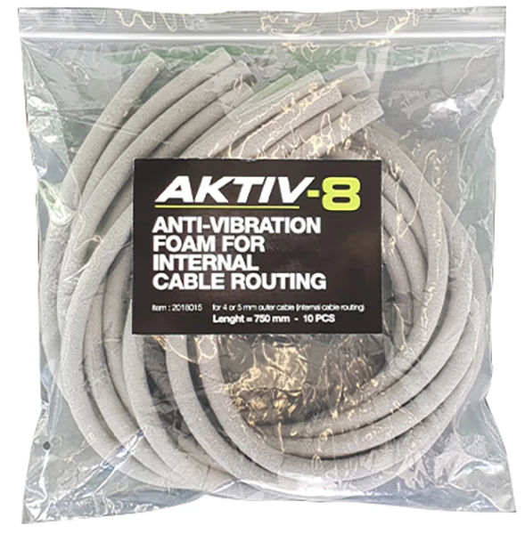 La gaine en mousse anti-vibrations AKTIVE-8 de 750 mm de long pour le passage interne des câbles est super légère et empêche le bruit et le cliquetis des gaines extérieures de frein et de dérailleur posées à l’intérieur. La gaine en mousse est facile à monter et résiste au liquide de frein.