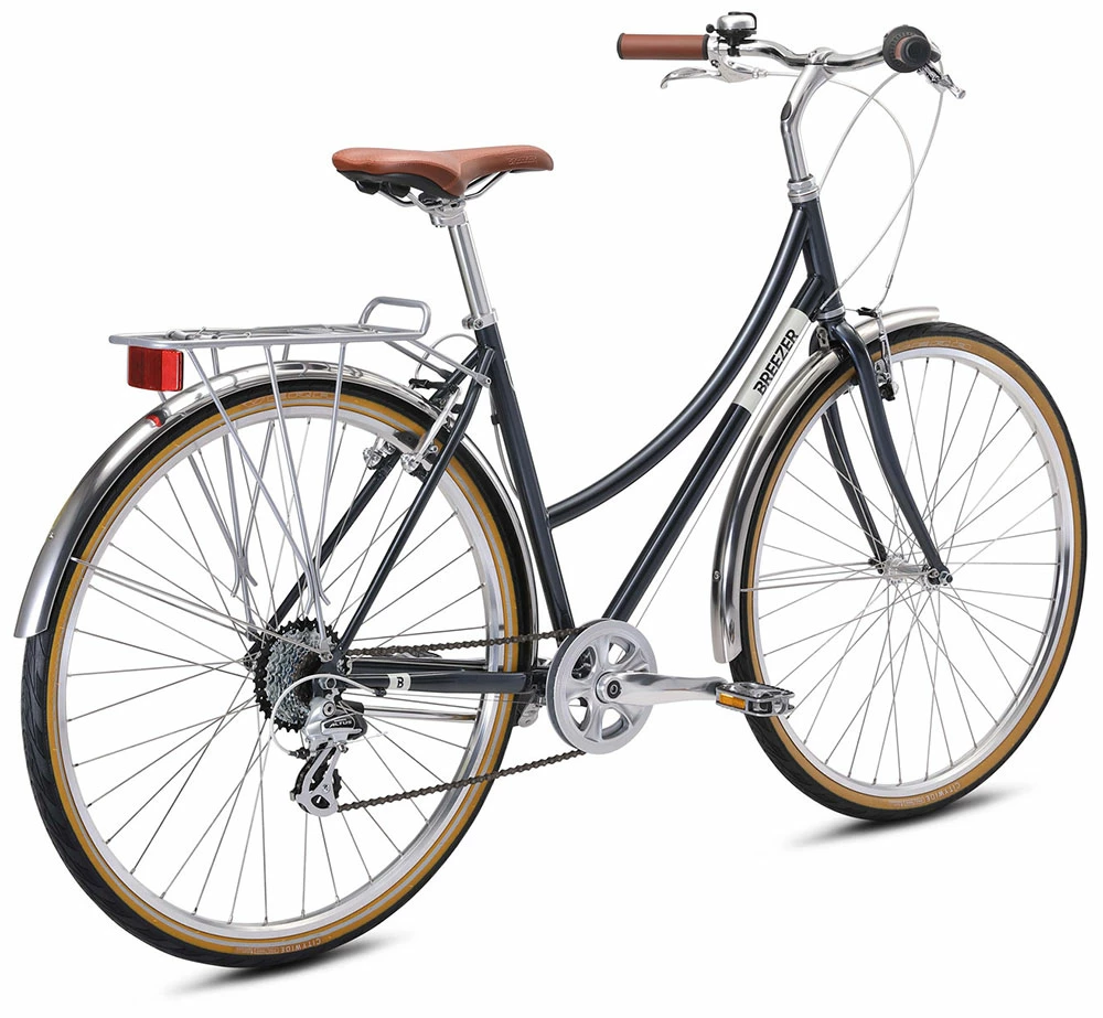 The Downtown is Breezer’s classic chromoly steel town bike: 700C wheels, equipped with matching fenders and chainguard, rear rack, kickstand, and bell.