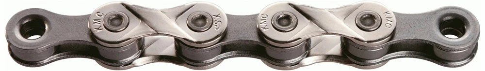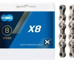 La chaîne X8 de KMC, extrêmement durable, sans dépendance du sens de marche et avec une surface nickelée pour les systèmes de changement de vitesse à 6/7/8 vitesses.