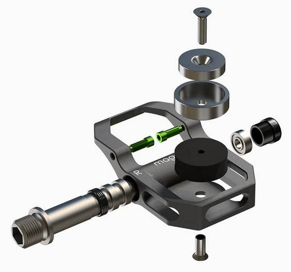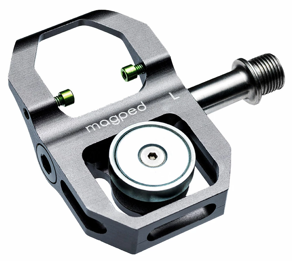 - Technologie : La pédale magped est équipée de 3 roulements étanches de type industriel de haute qualité. Les axes peuvent être échangés si nécessaire. L’aimant en néodyme haute performance est réglable au moyen d’une unité d’amortissement en polymère intégrée.
