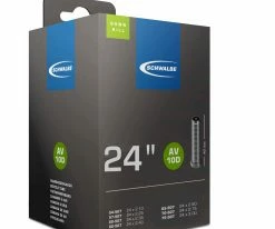 La chambre à air AV 10D de Schwalbe, équipée d’une valve Schrader, est adaptée aux vélos de descente 24″ avec des pneus d’une largeur de 2,1″ à 3″.