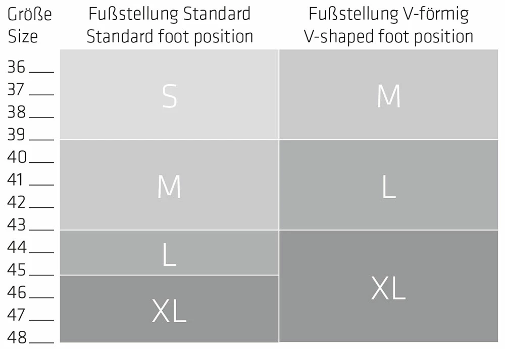 La surface d’appui des pédales est toujours horizontale. Certains fournisseurs de produits prétendument ergonomiques proposent des pédales ou des chaussures avec un angle déjà intégré, appelé « cale en V ». Dans ce cas, le pied est légèrement soulevé sur le côté intérieur. Ce concept est très controversé parmi les spécialistes. L’homme est habitué depuis des millions d’années à marcher sur un sol plat. Même si le mouvement de pédalage est encore tout à fait nouveau pour le développement biomécanique de l’homme, l’angle du pied est une valeur très individuelle. Ainsi, selon toute vraisemblance, il y a même plus de personnes qui ont besoin d’un coin dans la direction opposée. L’alignement des pieds se fait mieux dans la chaussure et de préférence avec des semelles intérieures.